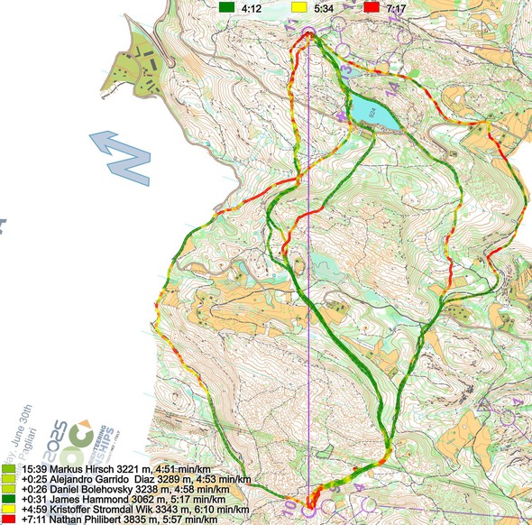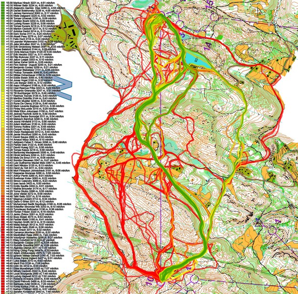 Then you can take a look at how the runners have solved this leg below. The routes are colored according to fastest split time on the leg, with the fastest routes in green and the slowest in red.