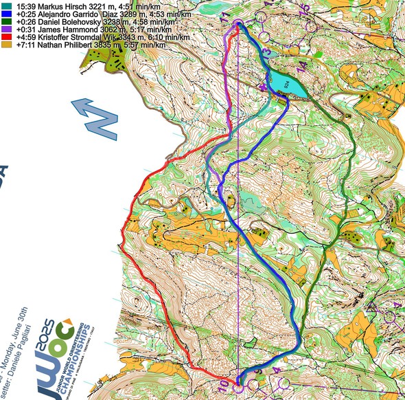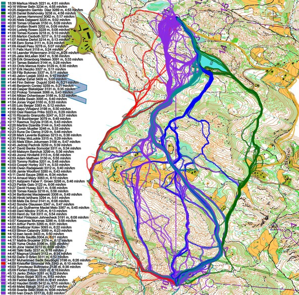 Below the routes are colored according to variant to give a clearer view of the how many runners chose each variant. A lot of different variants were chosen by the competitors, and four main of these variants where good – the turquoise, the blue, the green and the purple. The fastest runner on each of those four variants were actually within half a minute as you can see below. But looking at analysis of the different parts of the leg separately (at the bottom of the article), the turquoise should be the fastest if runners managed to execute it well.