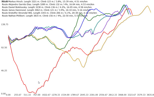 Taking a closer look at the six main alternatives (with an approximate elevation profile below the map), we can see that the reason the left (red) and the right (orange) are slow is there is too much climb – in addition the orange one is also substantially longer. The four other alternatives have approximately the same amount of climb, but the purple being a bit shorter.