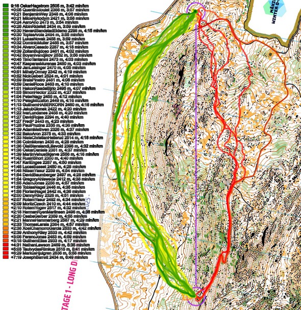 Then you can take a look at how the runners have solved this leg below. The routes are colored according to fastest split time on the leg, with the fastest routes in green and the slowest in red. From the analysis it is very obvious that everybody except 5 runners in M21 Superelite understood that it was faster to run left, mainly because the variant to the left has less climb. It might be tempting to go all around to the right on the road for the good runnability on the road, but then you would get a longer route in addition to the added climb. Even if it seems very obvious when looking at the analysis, I decided to include this leg more as a “trap” as it is maybe not that obvious for an armchair orienteer?