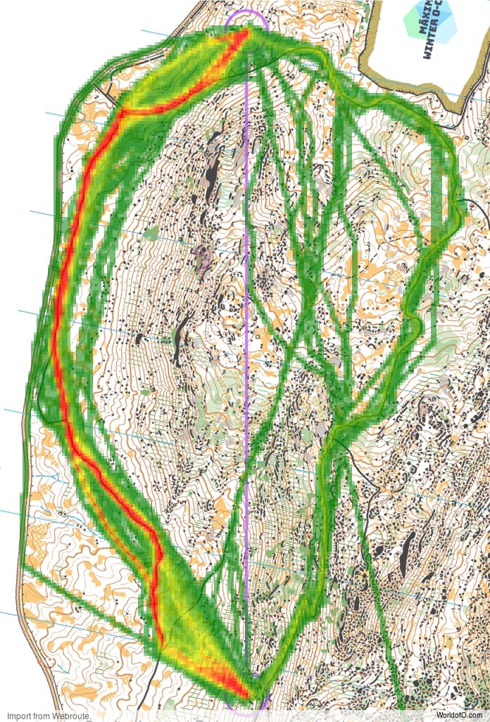 Then you can take a look at how the runners have solved this leg below. The routes are colored according to fastest split time on the leg, with the fastest routes in green and the slowest in red. From the analysis it is very obvious that everybody except 5 runners in M21 Superelite understood that it was faster to run left, mainly because the variant to the left has less climb. It might be tempting to go all around to the right on the road for the good runnability on the road, but then you would get a longer route in addition to the added climb. Even if it seems very obvious when looking at the analysis, I decided to include this leg more as a “trap” as it is maybe not that obvious for an armchair orienteer?