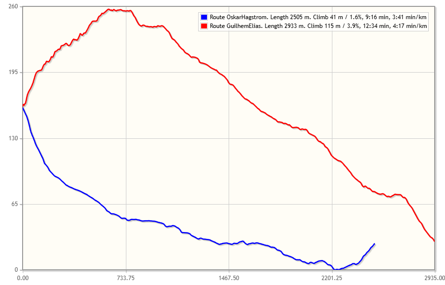 And finally the coarse elevation profile for the fastest alternative to the left and right – note the extra climb: