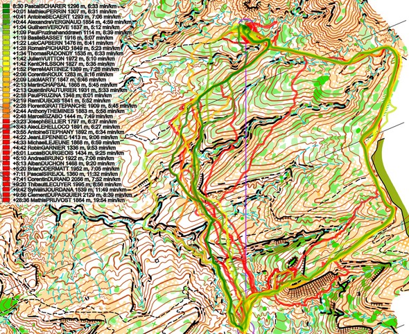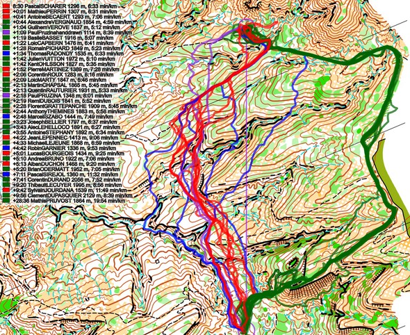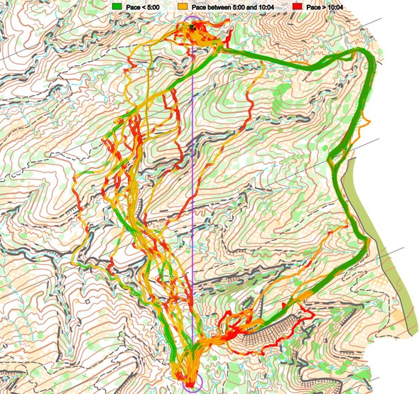 Below the routes are colored according to variant to give a clearer view of the how many runners chose each variant. As you can see the three fastest routes are run to the left, the next two to the right.