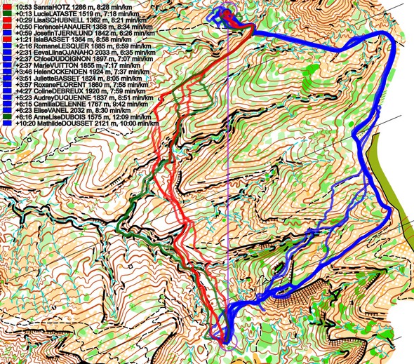 Then you can take a look at how the runners have solved this leg below – starting with the men. The routes are colored according to fastest split time on the leg, with the fastest routes in green and the slowest in red. As you can see, the fastest routes are run to the left (the same is the case for the women further down), but time differences are generally not that big. Running left is surely more challenging technically, mentally and physically, but right is longer 4-600 meters longer – and with approximately the same amount of climb left is probably the best choice for top orienteers while many would benefit from running to the right. Please add a comment below if you have additional thoughts about this leg.