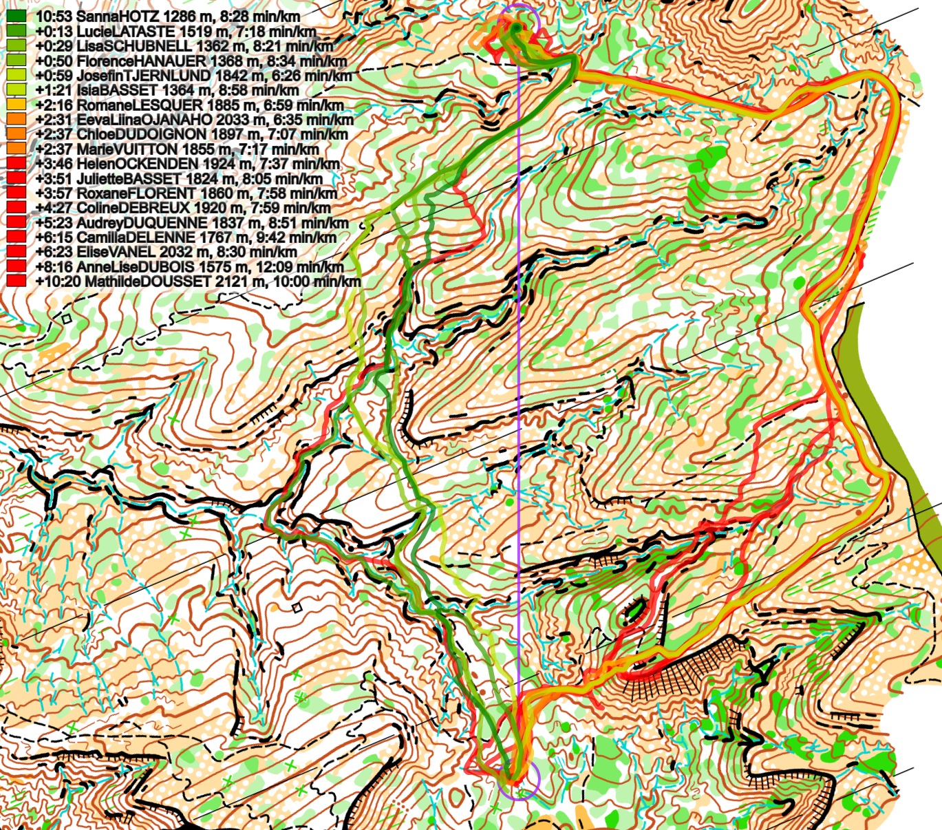 Then you can take a look at how the runners have solved this leg below – starting with the men. The routes are colored according to fastest split time on the leg, with the fastest routes in green and the slowest in red. As you can see, the fastest routes are run to the left (the same is the case for the women further down), but time differences are generally not that big. Running left is surely more challenging technically, mentally and physically, but right is longer 4-600 meters longer – and with approximately the same amount of climb left is probably the best choice for top orienteers while many would benefit from running to the right. Please add a comment below if you have additional thoughts about this leg.