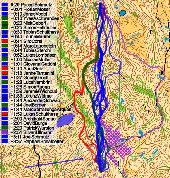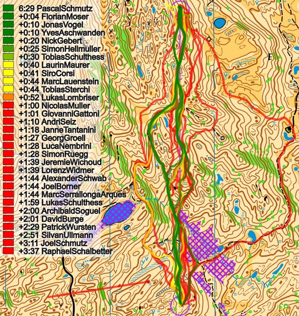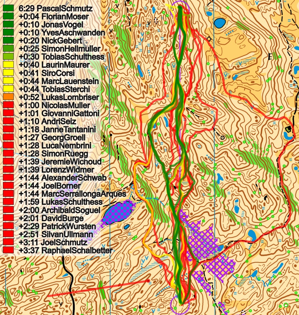 Then you can take a look at how the runners have solved this leg below. The routes are colored according to fastest split time on the leg, with the fastest routes in green and the slowest in red. As you can see, the fastest option is to go straight, and very few decide to use the paths. The only one running around on the path to the right is actually Silvan Ullman – a route choice I think several of World of O’s readers will find relevant…?