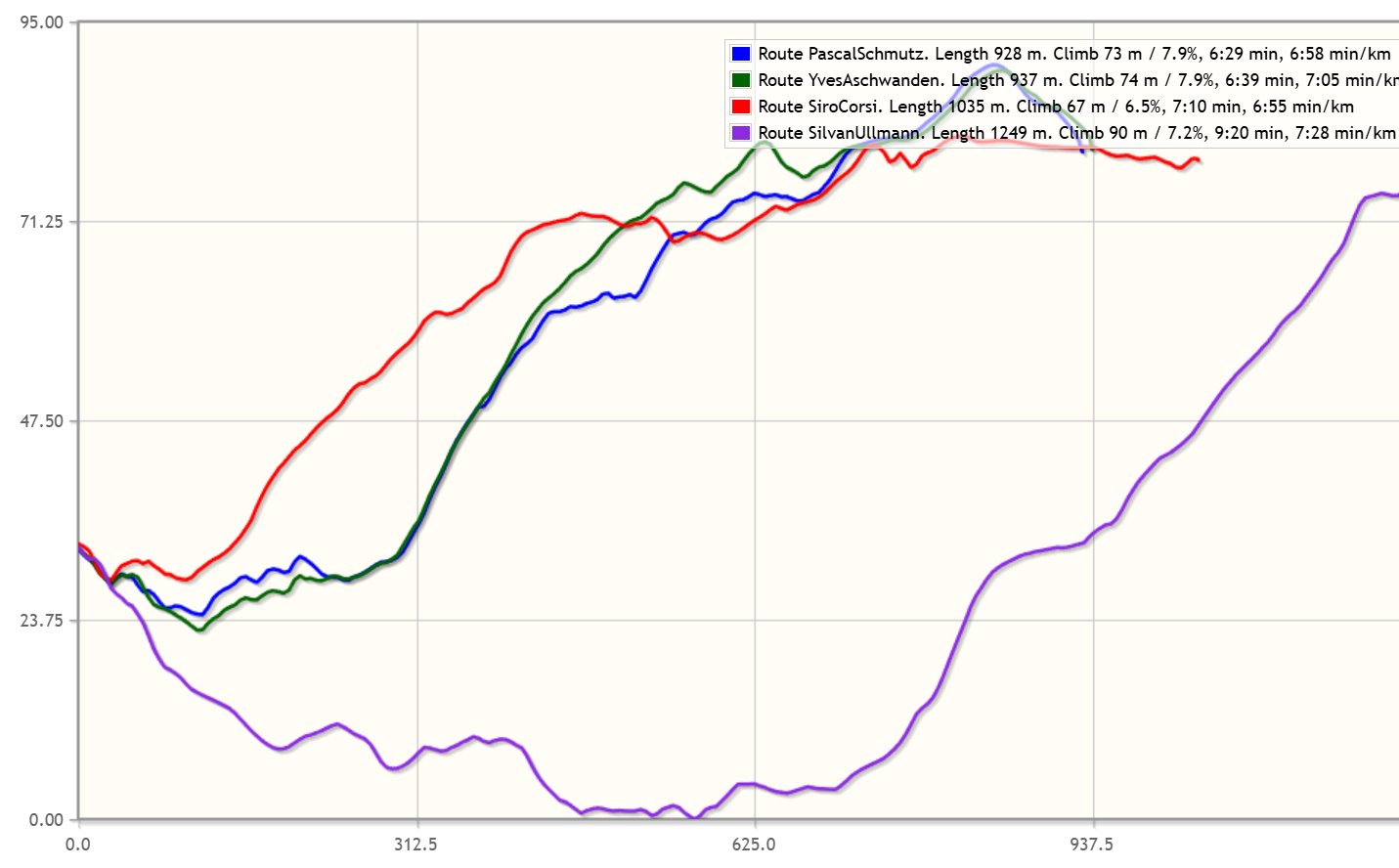 Here the fastest route on each of the four variants is shown separately, along with a coarse Google Elevation plot for the elevation profiles below. As you can see, the main reasons for the purple path-route being slower is the extra climb and the extra length, with the runnability in the terrain not being that slow here after all.