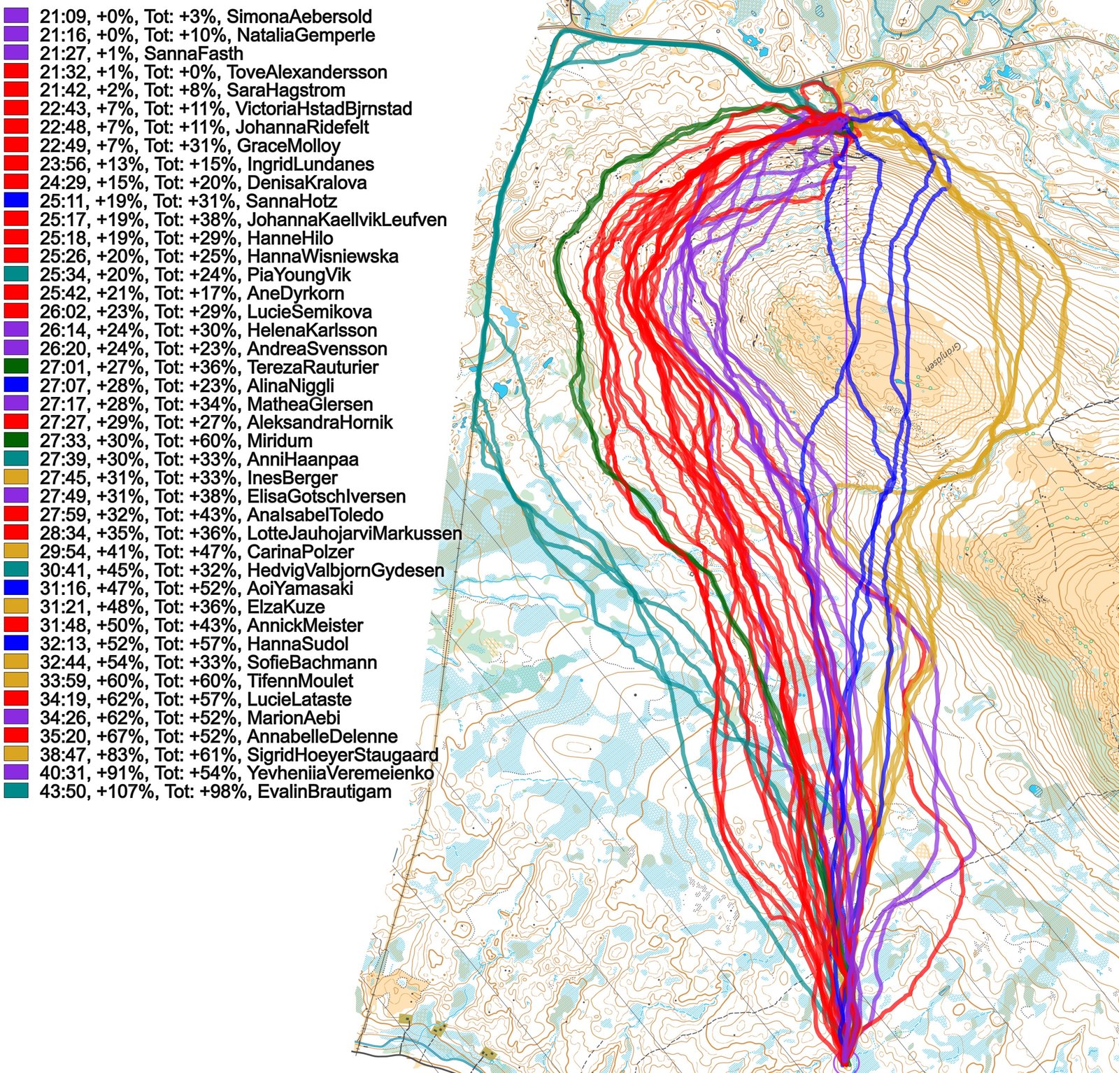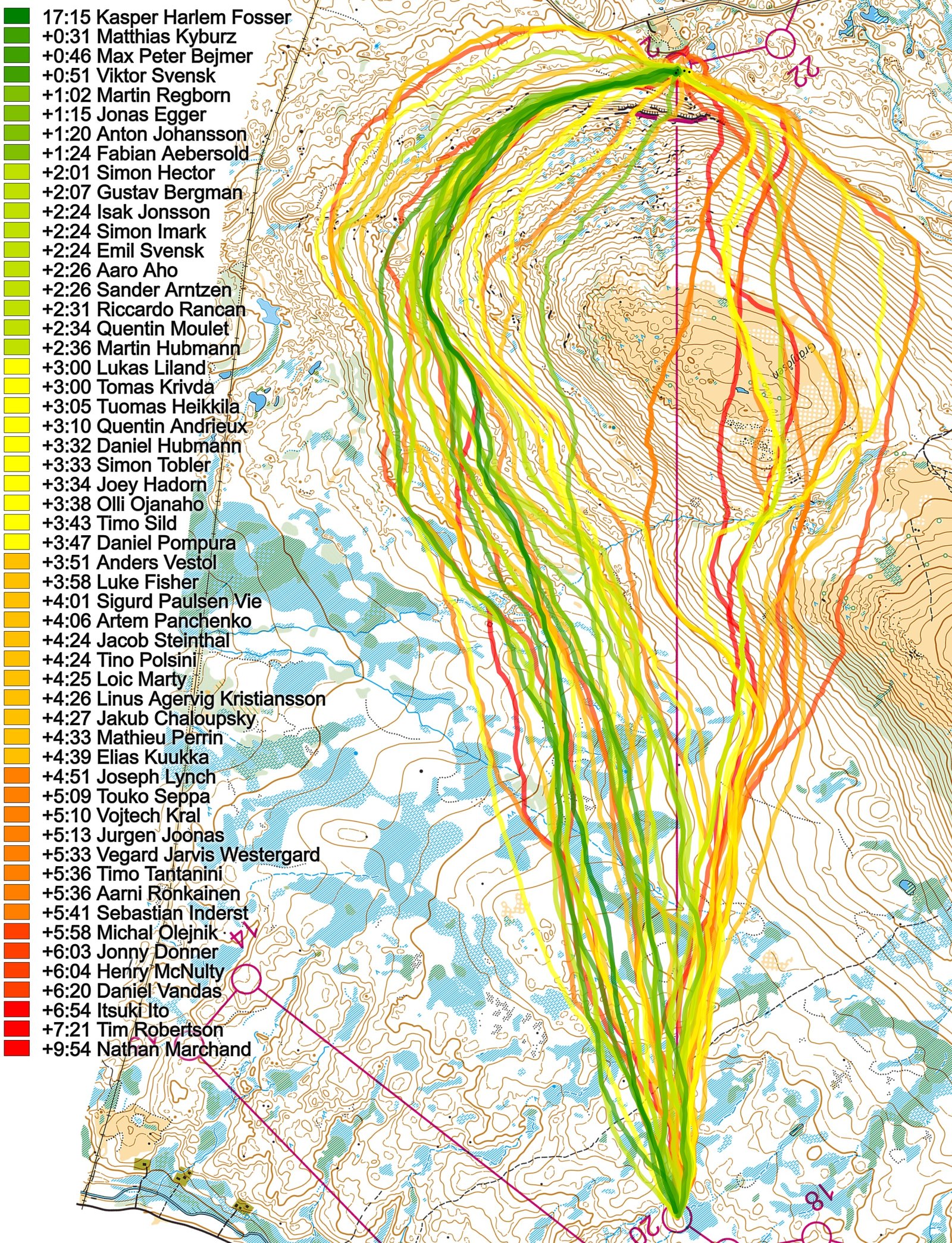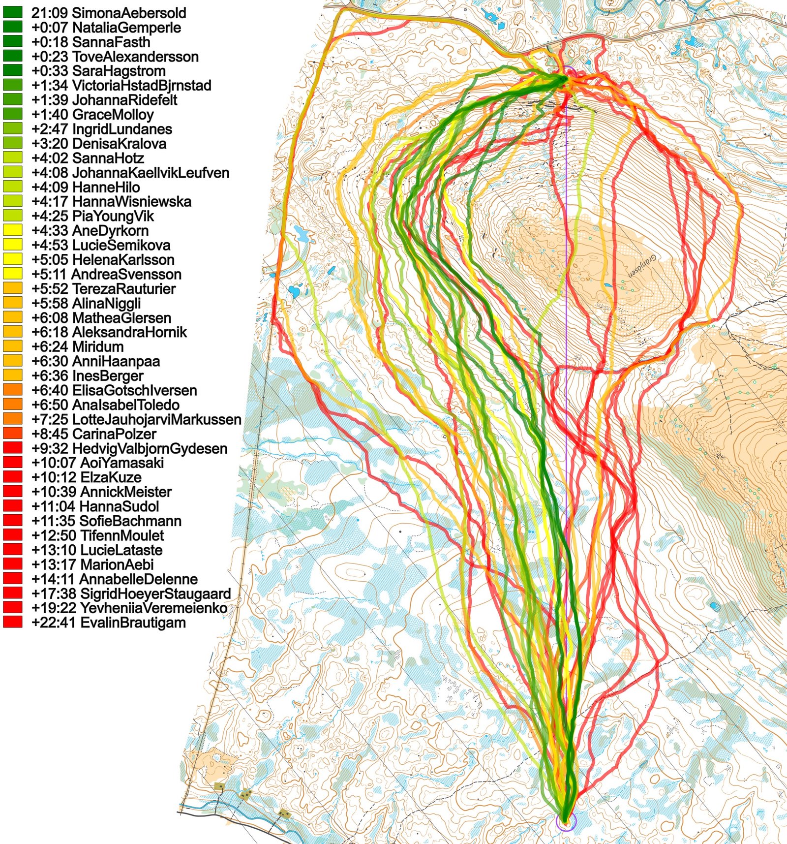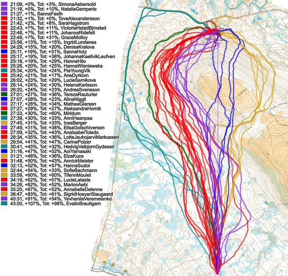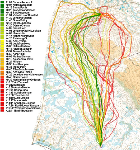 Then you can take a look at how the runners have solved this leg below (first the men, then the women). The routes are colored according to fastest split time on the leg, with the fastest routes in green and the slowest in red. Both for the men and the women the fastest alternative was to move along the slope while staying at roughly the same elevation, although the fastest women climbed a few meters more. Going over the top lost you a lot of time both in the men’s and women’s class, but as often is the case it was worse in the women’s class. It is also interesting to see that in the women’s class some chose to run all the way around on the road to the left, actually not losing that much time.