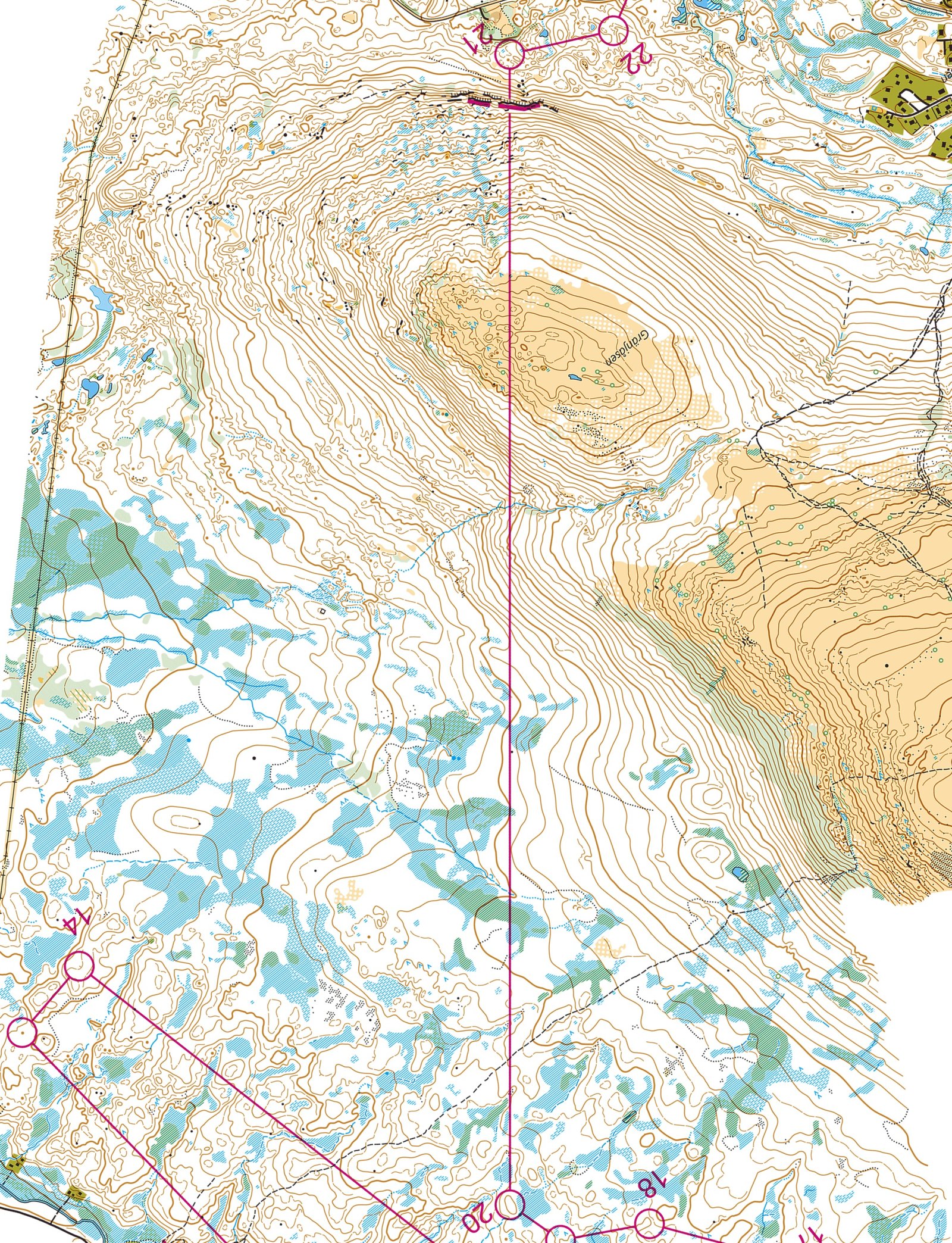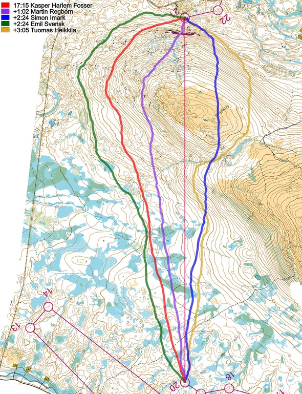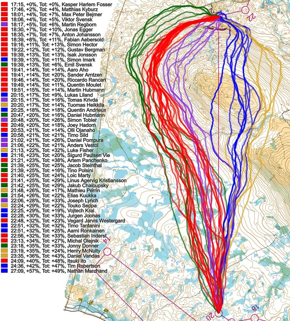 There were actually several interesting legs on this course. Here we chose the last of the long legs as the same leg was featured both in the men’s and women’s class, and as it offered quite a few different routechoices. The leg is as usually first provided without routes – you may take a look at it and think about how you would attack this leg (if the image is too small, you may click on it to get it larger):