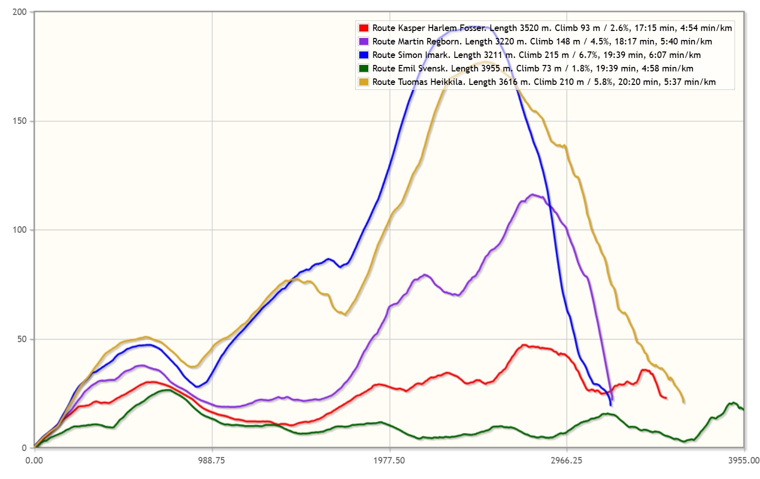 Finally a look at the fastest runner on each variant in the men’s class, along with a coarse elevation profile from Google Elevation.