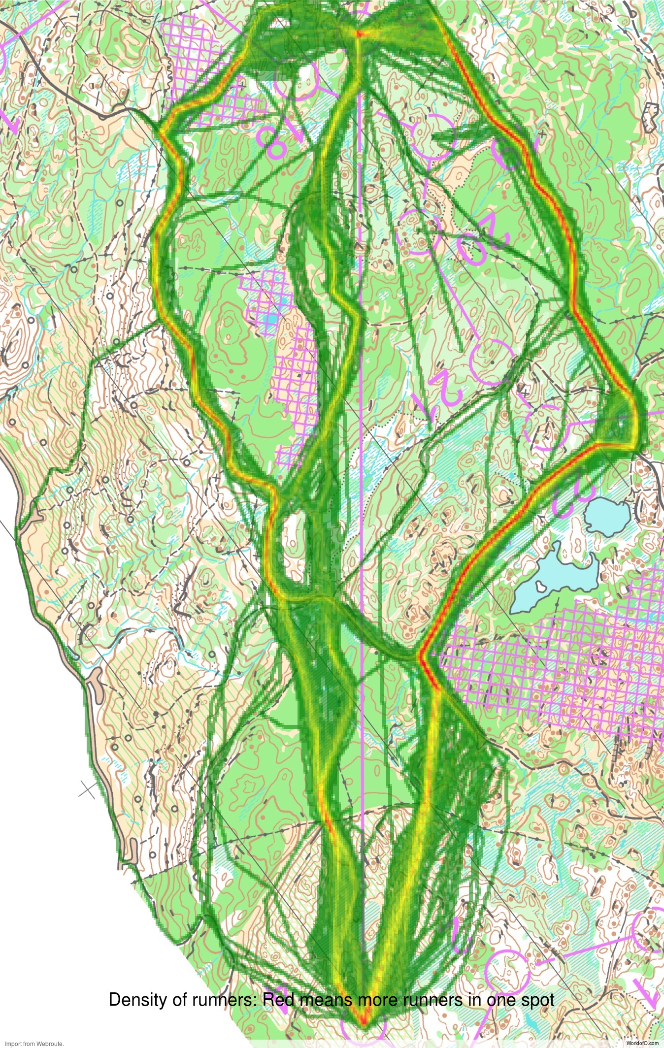 Then you can take a look at how the runners have solved this leg below. The routes are colored according to fastest split time on the leg, with the fastest routes in green and the slowest in red. As you can see, going left is clearly the fastest, even if you have to take the leg “from behind” here.
