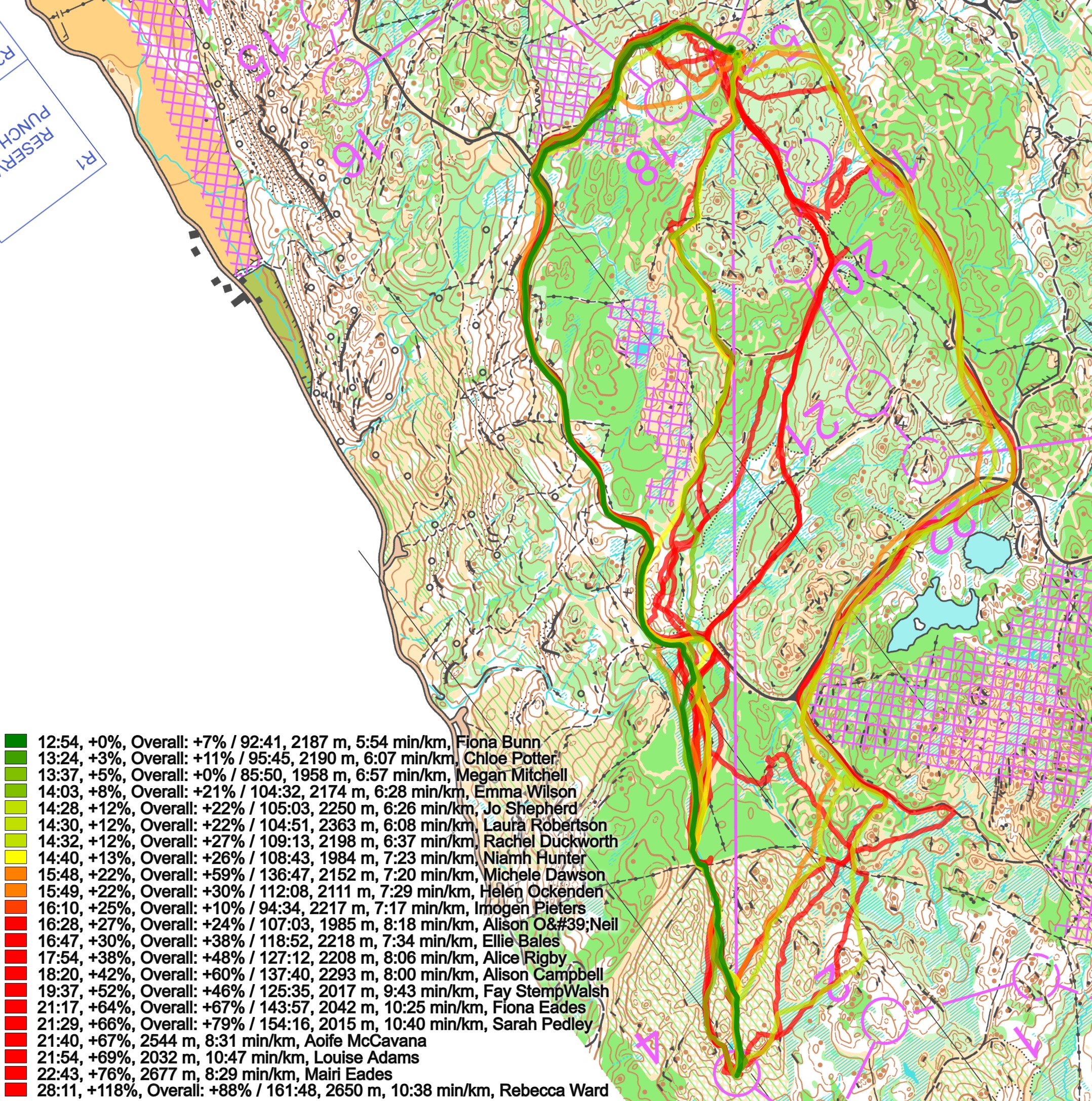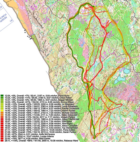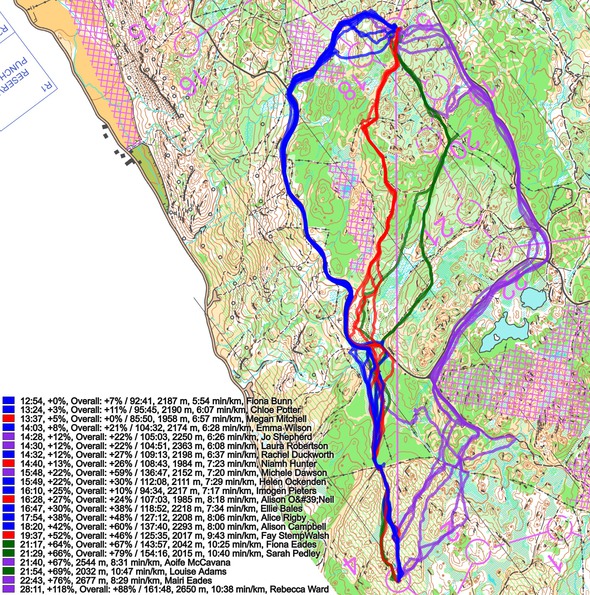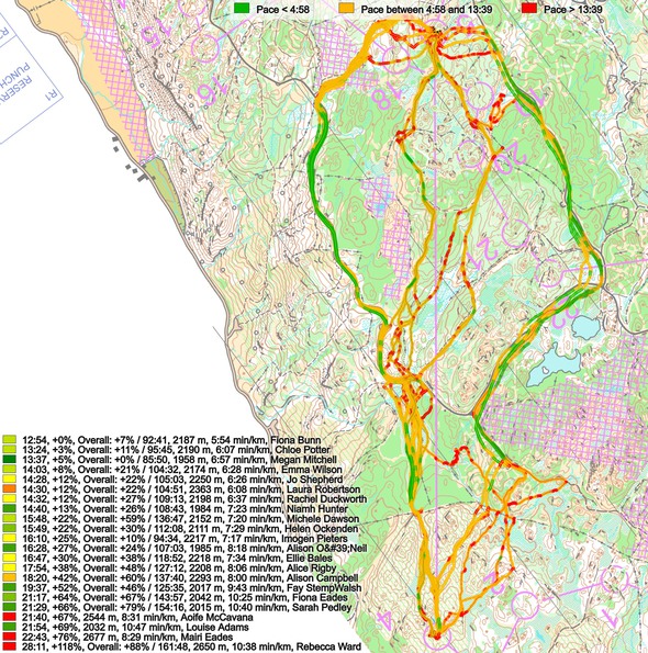 Below the routes are colored according to variant to give a clearer view of the how many runners chose each variant. The two fastest on the leg go left, but the clear winner of the day, Megan Mitchell goes straight and loses around 45 seconds. None of the top runners take the option to the right, but based on the split times compared to their total times they actually perform pretty well, so going to the right may also be a quite good alternative here. Note that you save some climb by going right, while at the same time you are running quite much on hard surface (which I am sure is a delight compared to much of the terrain here). Also when looking at the men’s course where the control corresponding to the 5th control was placed a bit more to the right, that was the clearly best choice there.
